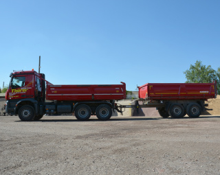 5 Seitenkipper, einen Tieflader, einen Radlader, einen Gabelstabler, eine Siebanlage, 2 Transporter und einen Ford Ranger mit einem 3-Seiten Kipper Anhänger.